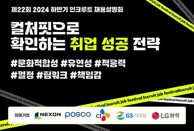 [일간환경연합 신상미 기자]넥슨코리아, 포스코, LG화학, GS리테일, CJ 인사 담당자들을 한자리에서 만날 수 있는 ‘2024 하반기 인크루트 채용설명회’가 열린다.