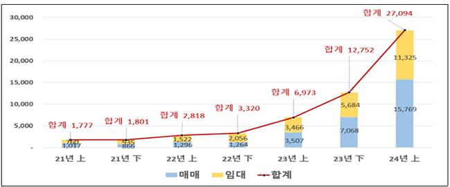 전자계약시스템이 도입된 초기에는 공공기관에서 주로 사용하였으나, 최근에는 민간의 매매·임대차 계약 등 중개 거래에서도 전자계약 사용이 확산되어, ’24년 상반기 중개거래 전자계약 건수가 전년동기 간 대비 4배 증가하는 등 이용률이 증가하고 있다.
