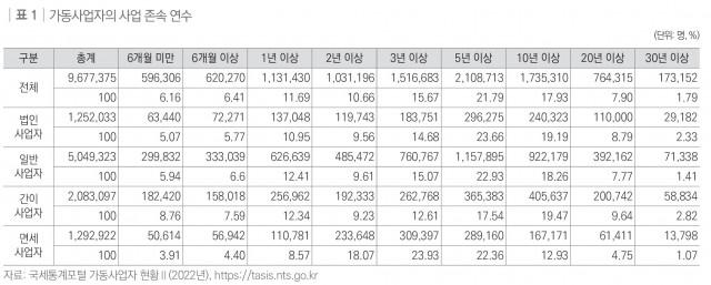 ※ 자영업 현황 및 사업 존속 연수 파악을 위해 국세통계포털의 가동사업자 현황 데이터 분석(2022년 기준)