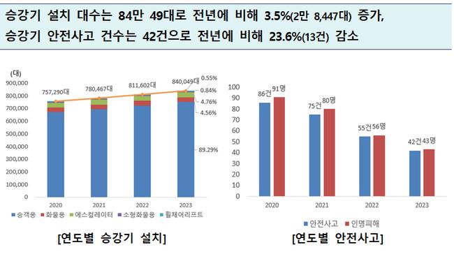 승강기 설치 대수는 84만 49대으로 전년(81만 1,602대)에 비해 3.5%(2만 8,447대) 증가했다.