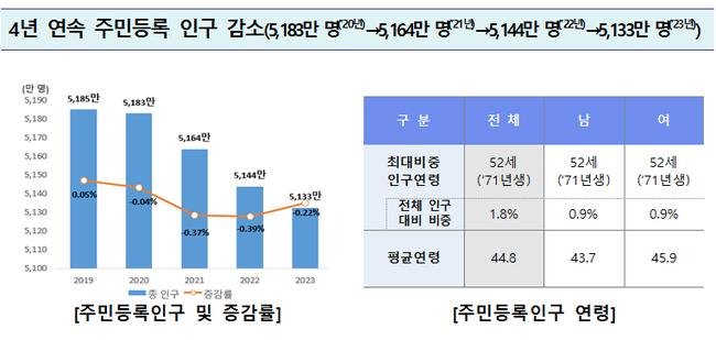 주민등록인구는 5,132만 5,329명으로 전년(5,143만 9,038명)에 비해 0.22%(11만 3,709명) 감소했으며, 4년 연속 인구감소(5,183만 명(2020년, -0.04%) → 5,164만 명(2021년, -0.37%) → 5,144만 명(2022년, -0.39%) →5,133만 명(2023년, -0.22%)) 추세를 보였다.