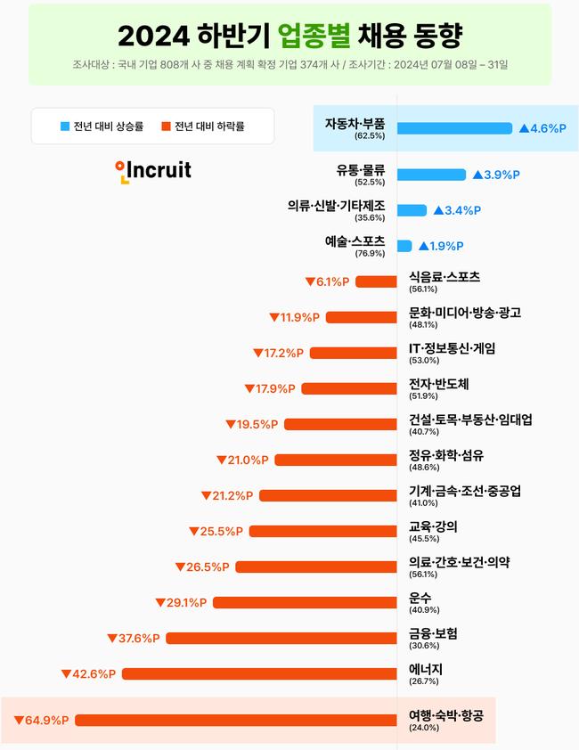 반면, 총 17개 업종의 올 하반기 신입 채용계획 비율 중 무려 13개 업종이 전년 대비 하락세를 보였다. 가장 하락 폭이 큰 업종은 △여행·숙박·항공(24.0%)으로 전년 대비 64.9%P 하락했다.