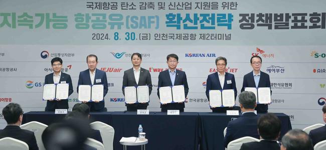 안덕근 산업통상자원부 장관과 박상우 국토교통부 장관은 2024. 8. 30(금) 10:00 인천국제공항 제2터미널에서 이학재 인천국제공항공사 사장, 박주선 한국석유협회장, 김상협 탄녹중립녹색성장위원장, 한국공항공사 부사장, 오종훈 SK에너지 대표, 우기호 대한항공 대표를 비롯한 항공사, 정유사 등 관계자가 참석한 가운데 열린 「지속가능항공유(SAF) 확산 전략 발표」를 주재하고, 국내 SAF 사용확대에 상호 협력을 위해 산업부・국토부, 국적항공사・국내 정유사, 인천국제공항공사・한국공항공사 간 SAF 상용운항을 위한 양해각서(MOU)를 체결하고, 인사말을 한 후 국제항공 탄소감축과 新산업 창출을 위한 지속가능항공유(SAF) 확산 전략을 공동으로 발표했다.