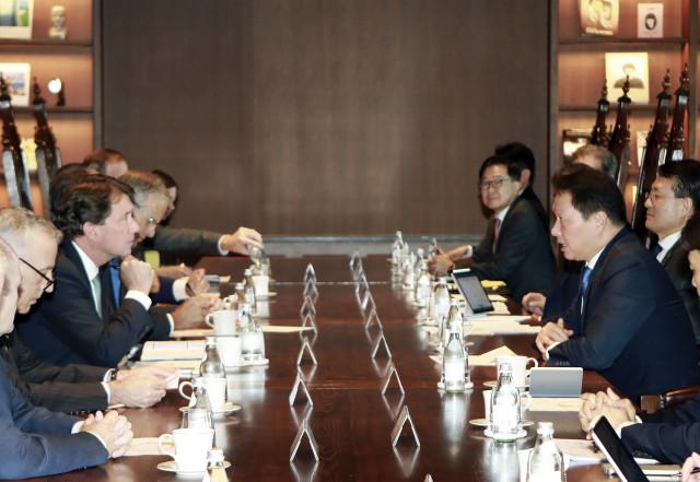 최태원 SK 회장(사진 오른쪽 가운데)이 서울 종로구 서린사옥에서 미국 상원의원 대표단과 경제협력 방안을 논의하고 있다