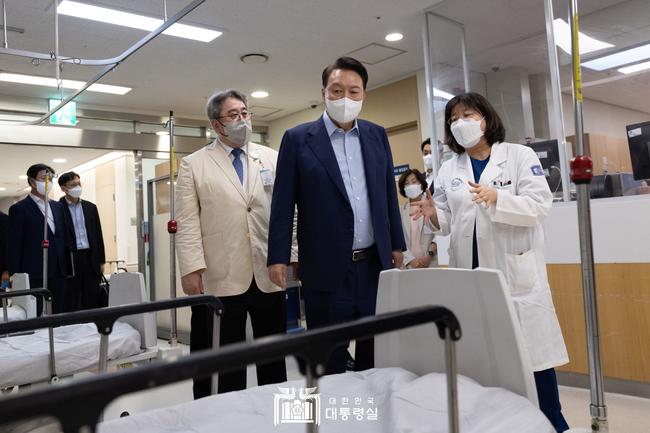 윤석열 대통령이 지난 9월 4일 저녁 8시 50분 쯤 의정부 성모병원 권역응급의료센터를 방문해 1시간 20분 가량 머물며 국민 건강을 위해 헌신하고 있는 의료진을 격려하고 현장의 의견을 청취했다.
