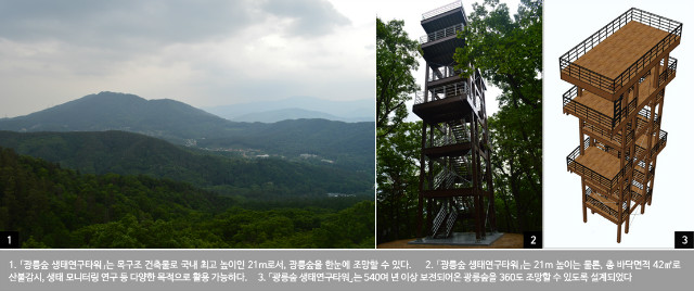 「광릉숲 생태연구타워」는 관람객의 출입이 제한된 광릉숲의 중심부에 위치하고 있으며, 꼭대기에서 광릉숲을 육안으로 360도 조망할 수 있어 산불 감시, 수목 및 야생동물 관찰, 장기생태 모니터링 연구 등 다양한 목적으로 활용할 예정이다.