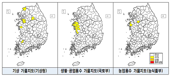 가뭄 예 경보:기상 생활 공업 농업 용수별로 구분. 지도에 색깔로 표시하고 지역 명시. <제공=국민안전처> |