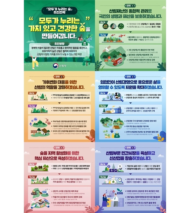 이번 전략은 기후변화에 대응해 국민안전과 탄소중립을 실현하고 임업인의 자율적인 경영을 지원하는 한편, 숲에서 새로운 성장 동력을 창출해 저성장과 지역소멸의 문제 해결에 기여하기 위한 5대 전략을 담았다.