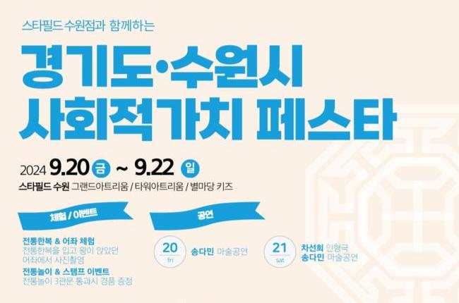 경기도주식회사는 9월 20일부터 9월 22일까지 스타필드 수원점, 27일부터 29일까지 스타필드 고양점에서 진행되는 ‘2024 경기도 사회적가치 페스타’ 기획전에 참여한다고 12일 밝혔다.