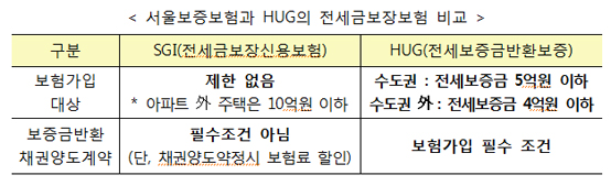 서울보증보험의 전세금보장보험은 HUG의 상품과 달리 가입대상 전세보증금 규모의 제한이 없다.