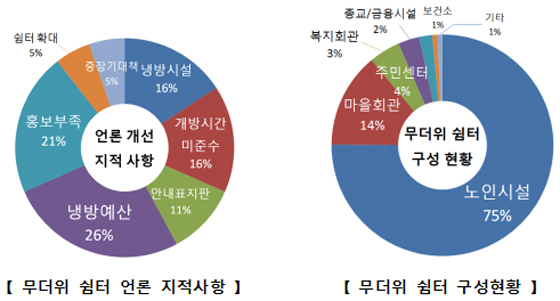 또 안전처 등 정부합동 폭염대비 점검에서 적발된 62건의 미흡사항 중에는 운영시간 미준수, 안내간판 미정비 등 쉼터 관련 내용이 49건을 차지했다.