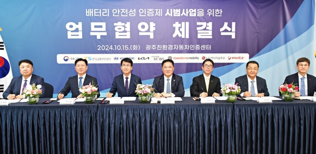 ▲ 15일 광주광역시 빛그린 산업단지에 위치한 자동차안전연구원 친환경 자동차·부품 인증센터에서 열린 ‘배터리 안전성 인증제’ 시범사업 실시를 위한 업무협약식에서 백원국 국토교통부 제2차관(가운데), 현대차그룹 김동욱 부사장(왼쪽 세번째) 등 주요 관계자들이 기념 촬영을 하고 있다.(ⓒ뉴스1,) 배터리 인증제는 전기차 안전성을 높이기 위해 전기차에 장착하는 배터리의 안전성을 정부가 사전에 직접 시험해 인증하는 제도로, 자동차관리법 개정에 따라 내년 2월 시행을 앞두고 있다.