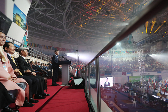 문 대통령은 스포츠는 모든 장벽과 단절을 허무는 가장 강력한 평화의 도구로 함께 흘리는 땀은 화해와 통합을 만드는 촉매제가 되고 있다 며 저는 평화를 만들어 온 스포츠의 힘을 믿는다. 이번 대회를 통해서 새 정부의 첫 남북 체육교류협력이 이뤄진 것을 대단히 기쁘게 생각한다 고 말했다.