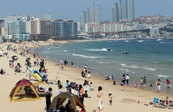 부산 해운대해수욕장에서 나들이객들이 더위를 식히고 있다. (사진=연합뉴스 제공)7월에는 고기압의 가장자리에 들거나 저기압의 영향을 주기적으로 받아 대체로 흐린 날이 많겠고 후반에는 점차 북태평양고기압의 영향을 받을 것으로 예상된다.