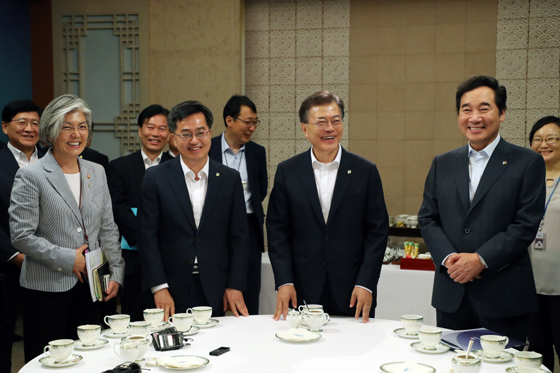 문재인 대통령이 27일 오전 청와대에서 취임 후 첫 국무회의를 주재하기에 앞서 열린 차담회에서 국무위원들과 얘기를 나누고 있다. 왼쪽부터 강경화 외교부 장관, 김동연 부총리 겸 기획재정부 장관, 문 대통령, 이낙연 총리. |