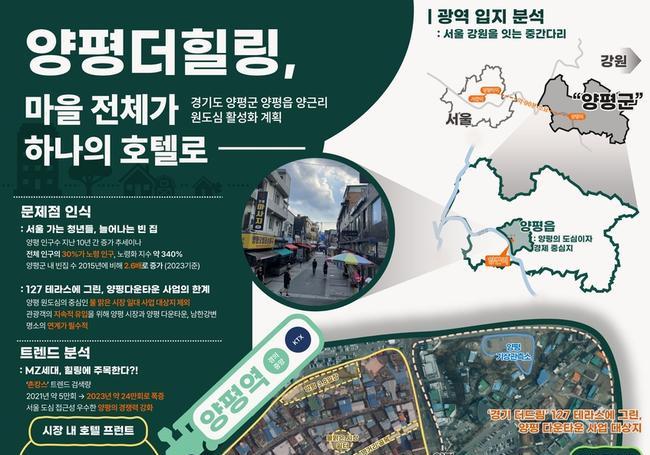 공모전 대상 작품으로는 빈집을 리모델링해 마을 전체를 하나의 호텔로 브랜드화 하고, `경기 더드림 재생사업, 127테라스에 그린 양평다운타운`과 연계성이 우수한 `양평더힐링, 마을전체가 하나의 호텔로`가 선정됐다.
