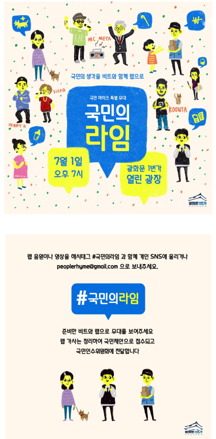랩 음원이나 영상을 해시태그 ‘#국민의라임’을 붙여 개인 소셜미디어(SNS)로 올리거나 이메일(peoplerhyme@gmail.com)로 보내면 된다. 당일 결원이 생기면 현장 접수도 진행할 예정이다.