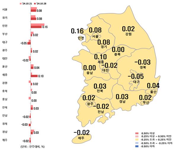 서울과 경기 지역의 전세가격 역시 상승세를 유지하고 있으며, 특히 세종 지역은 0.10%의 상승률로 타 지방에 비해 강세를 보였다.