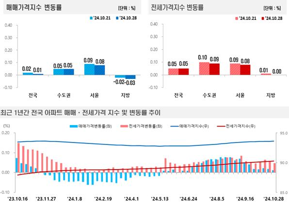 한국부동산원이 2024년 10월 4주(10.28일 기준) 전국 주간 아파트가격 동향을 조사한 결과, 매매가격은 0.01% 상승, 전세가격은 0.05% 상승을 기록했다.