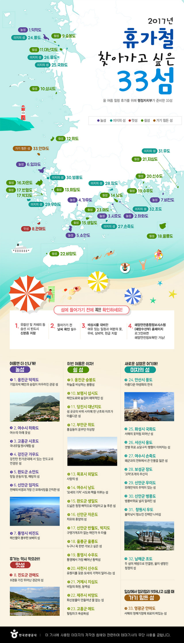 [일간환경연합 장민주 기자]휴가철을 앞두고 있습니다.찿아 가고 싶은 33개 섬을 소개합니다. 인포그래픽 뉴스로 한눈에 확인 가능 합니다.