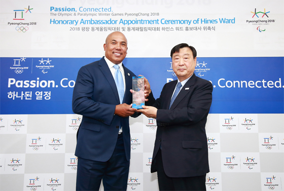 2018 평창동계올림픽 조직위원회는 2일 이희범 조직위원장이 조직위 서울사무소에서 하인스 워드에게 평창대회 홍보대사 위촉패를 수여했다고 밝혔다.