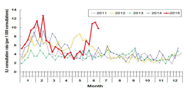 홍콩 계절 인플루엔자는 2015년 1~2월에 홍콩에서 유행이 시작되어 4월 중순에 종료되었다가, 6월 다시 증가한 후 7월부터 감소추세를 보이고 있다.
