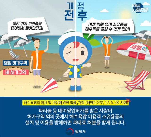 이번 여름부터 파라솔 대여업자가 자신이 허가받은 구역이 아닌 곳에서 개인 파라솔 설치와 이용을 방해하면 10만 원 이하의 과태료 처분을 받게 됩니다. 이유 없는 방해로부터 자유롭게, 신나는 해수욕을 즐기세요!