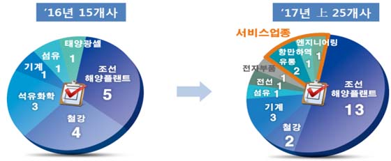 조선·해양플랜트 18개, 철강 6개, 석유화학 3개 등 3대 구조조정 업종이 27개로 전체의 67.5%를 차지했다. 이밖에 기계 4개, 섬유 2개, 태양광셀 1개, 유통·물류 3개, 엔지니어링 1개, 전선 1개, 전자부품 1개다.
