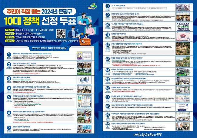 [일간환경연합 김경훈 기자] 은평구는 주민이 직접 뽑는 ‘2024년 은평구 10대 정책’을 선정하기 위한 온오프라인 투표를 오는 22일까지 진행한다고 밝혔다.
