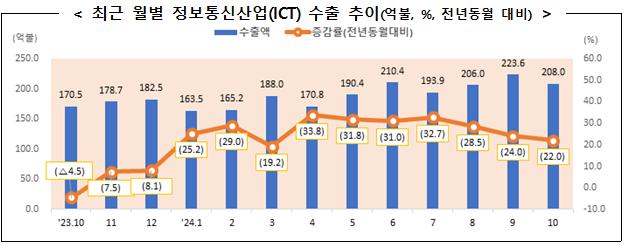 과학기술정보통신부는 2024년 10월 ICT 수출이 208억 달러로 역대 10월 최고치를 달성했다고 11월 14일 발표했다.