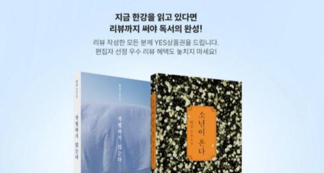 예스24는 한강 작품을 읽은 후 독서 커뮤니티 ‘사락’ 내에 리뷰를 작성한 회원 전원에게 YES상품권 1000원을 지급하며, 우수 리뷰 작성자로 선정된 5명에게는 YES상품권 5만원을 증정한다.