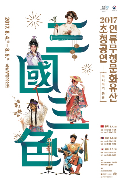 2017 인류무형문화유산 초청공연은 문화재청 국립무형유산원이 주최하고, 유네스코한국위원회, 일본 국립극장 오키나와, 주한일본국대사관, 중국 절강성비물질문화유산연구원이 후원한다. 공연은 무료이며, 오는 24일 오전 9시부터 국립무형유산원 누리집(www.nihc.go.kr)에서 사전예약을 할 수 있다. 10명 이상 단체관람은 전화(063-280-1500)로 문의하면 된다.