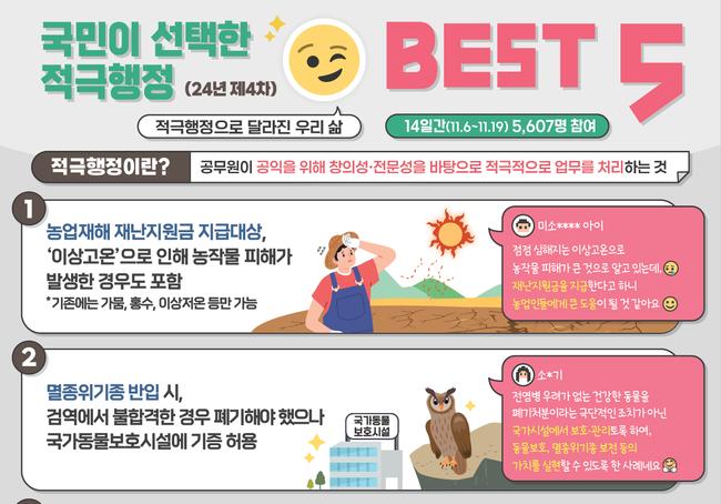 국무조정실은 2024년 11월 20일, 국민의 생활 편의를 높인 `적극행정 우수사례 BEST 5`를 발표했다.