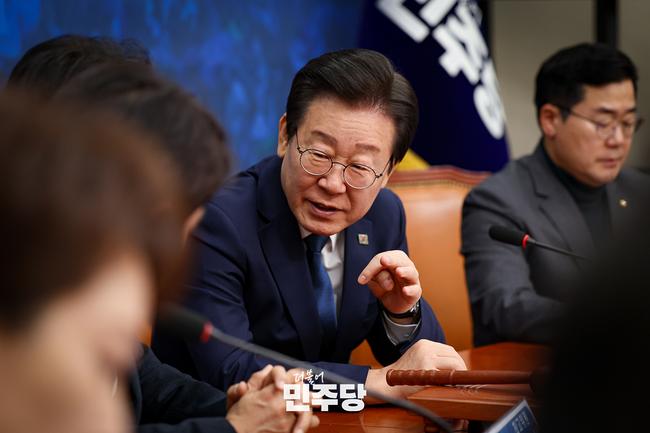이재명 당대표가 25일 국회 본청 당대표회의실에서 열린 최고위원회의에 참석하여 발언하고 있다.