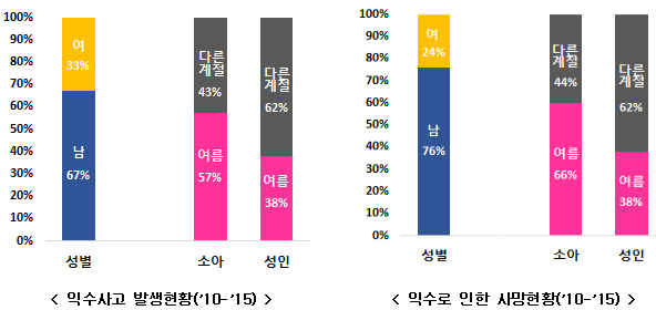 계절별 익수사고 사망도 여름 42%, 봄 22%, 가을 19%, 겨울 15% 등으로 여름철에 가장 많았다. 성별로도 남자가 여자보다 3배 정도 더 많이 익수사고로 목숨을 잃었다.