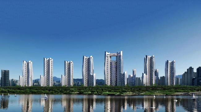 대지 레벨을 높이고 필로티 설계를 적용해 모든 세대가 한강 조망을 누릴 수 있도록 했으며, 외벽에는 클림트 파사드 패턴과 최고급 세라믹 패널을 적용해 단지를 하나의 예술작품으로 완성했다.