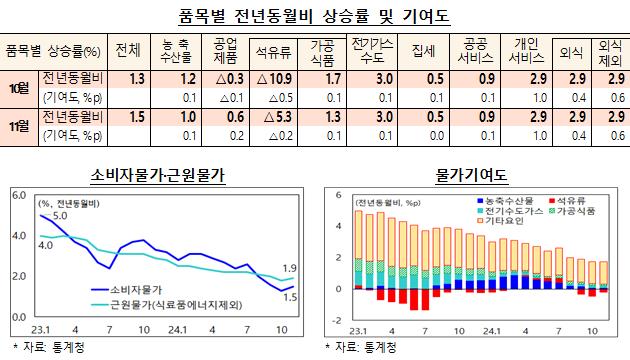 정부는 12월 3일 발표한 11월 소비자물가 동향에서 물가 상승률이 전년 동월 대비 1.5%로 10월의 1.3%보다 소폭 상승했으나 안정세를 유지했다고 밝혔다.