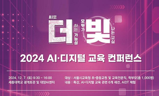서울특별시교육청(교육감 정근식)은 인공지능(AI)이 교육과 사회에 미치는 영향을 비판적으로 성찰하고 교육의 본질과 가치를 탐구하는 `2024 AI · 디지털 교육 컨퍼런스`를 12월 7일 세종대학교에서 개최한다.