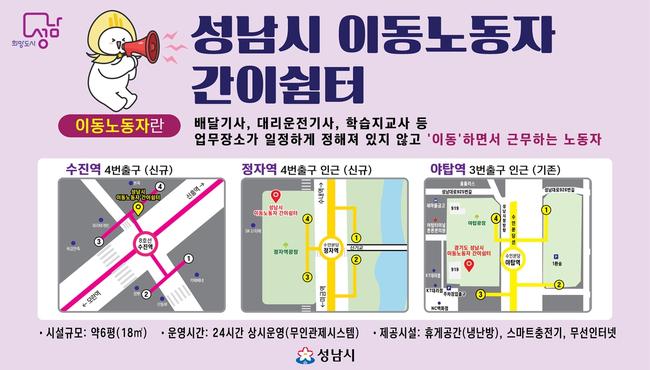 현재 성남동에 운영 중인 거점형 쉼터와 달리, 역 주변에 설치된 간이쉼터는 접근성이 뛰어나 짧은 휴식이 필요할 때 유용하며, 혹한·혹서기 등 이동노동자들의 고충 해결과 열악한 노동 환경 개선에 기여할 것으로 기대된다.