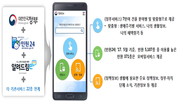 아울러 정부서비스 통합·연계를 위해 민원24, 정부대표포털, 알려드림e 등 행안부의 3개 시스템을 통합하고 소득확인증명(홈택스), 건강보험자격, 국민연금자격변동 등 타 기관 주요 서비스 22종을 시범 연계했다.