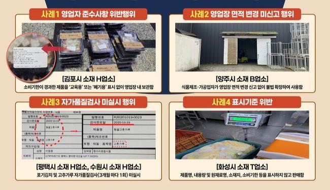 평택시 H업체는 고춧가루를 생산하면서 약 4년간 자가품질검사를 실시하지 않고 판매했으며, 화성시 T업체는 백김치를 판매하면서 제조연월일, 소재지 등의 식품표시 기준을 준수하지 않아 수사에 적발됐다.