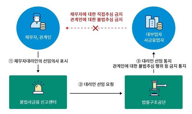 전화번호가 없는 등 채권자가 불분명한 경우에도 법률구조공단을 통해 채무자대리인 선임이 가능하도록 지원하는 방안을 추진하고, 추심업자가 채무자대리인 선임 이후에도 채무자에게 직접 연락하는 경우 형사 처벌이 가능하도록 처벌 근거를 보완하는 방안도 검토할 계획이다.