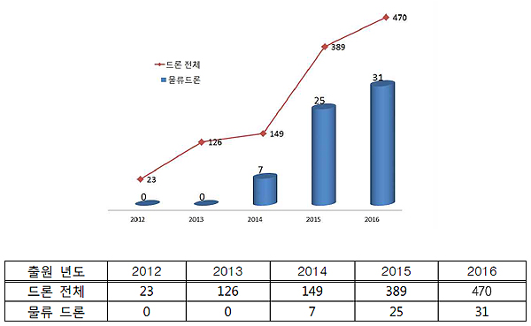 이러한 경향을 반영하듯 2013년까지 전무했던 물류용 드론 관련 출원은 2014년 7건을 시작으로 2015년에는 25건이 출원됐고 2016년에도 31건으로 그 증가세가 지속됐다.