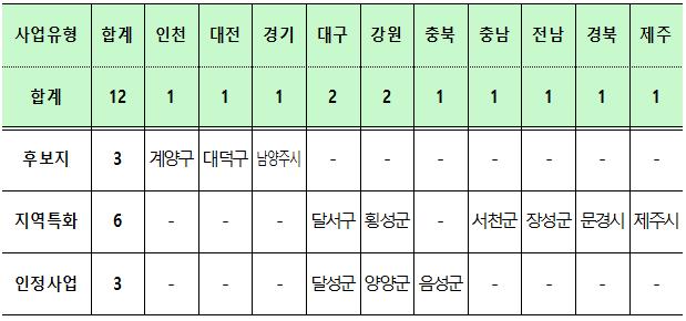 선정된 지역은 인천 계양구, 대전 대덕구, 대구 달서구와 달성군, 강원 횡성과 양양, 충남 서천, 전남 장성, 제주 제주시 등으로, 비수도권이 10곳(83%)을 차지했으며, 이 중 6곳(50%)은 인구 10만 명 이하의 소도시로 지역 균형발전 효과도 기대된다.