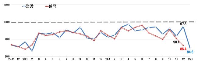 [일간환경연합 신상미 기자] 한국경제인협회(한경협)는 2025년 1월 기업경기실사지수(BSI) 전망치가 84.6으로 전월 대비 12.7포인트 하락했다고 발표했다. 이는 코로나19 초기였던 2020년 4월 이후 가장 큰 하락폭이다.