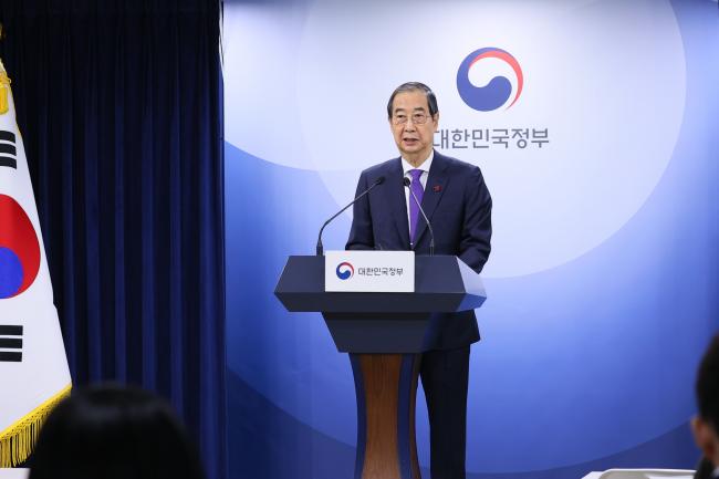 한덕수 대통령 권한대행 국무총리가 26일 서울 종로구 정부서울청사에서 긴급 대국민담화 발표하고 있다.