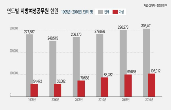 7일 행정안전부가 발간한 ‘자치단체 여성공무원 인사통계’에 따르면 2016년말 기준 전국 지자체 여성공무원 수는 10만 6012명으로 전체 34.9%를 차지했다. 2005년 5만 4472명에서 꾸준히 늘며 10만명을 돌파한 것이다.