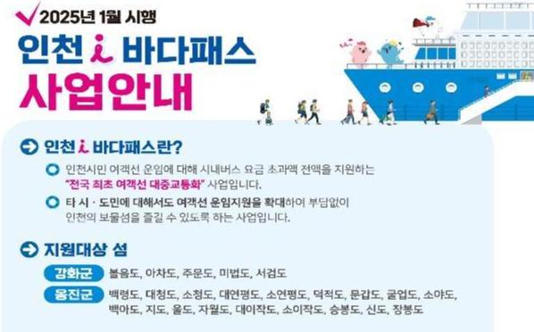 인천광역시(시장 유정복)가 전국 최초로 모든 시민이 시내버스 요금으로 여객선을 이용할 수 있는 `인천 아이 바다패스` 사업을 2025년 1월부터 본격 시행한다.
