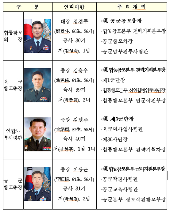 [일간환경연합 장영기 기자]정부는 8일 합참의장, 육군 및 공군 참모총장, 연합사 부사령관 및 군사령관 3명에 대한 인사를 단행했다.