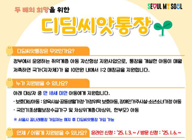 [일간환경연합 장민주 기자] 서울시는 새해부터 기초생활수급가구 및 차상위계층 아동도 ‘디딤씨앗통장’에 가입할 수 있도록 대상을 대폭 확대한다. 이 사업은 저축액의 2배를 매칭하여 적립금을 지원하는 방식으로, 취약계층 아동의 자립을 돕기 위한 목돈 마련 사업이다.